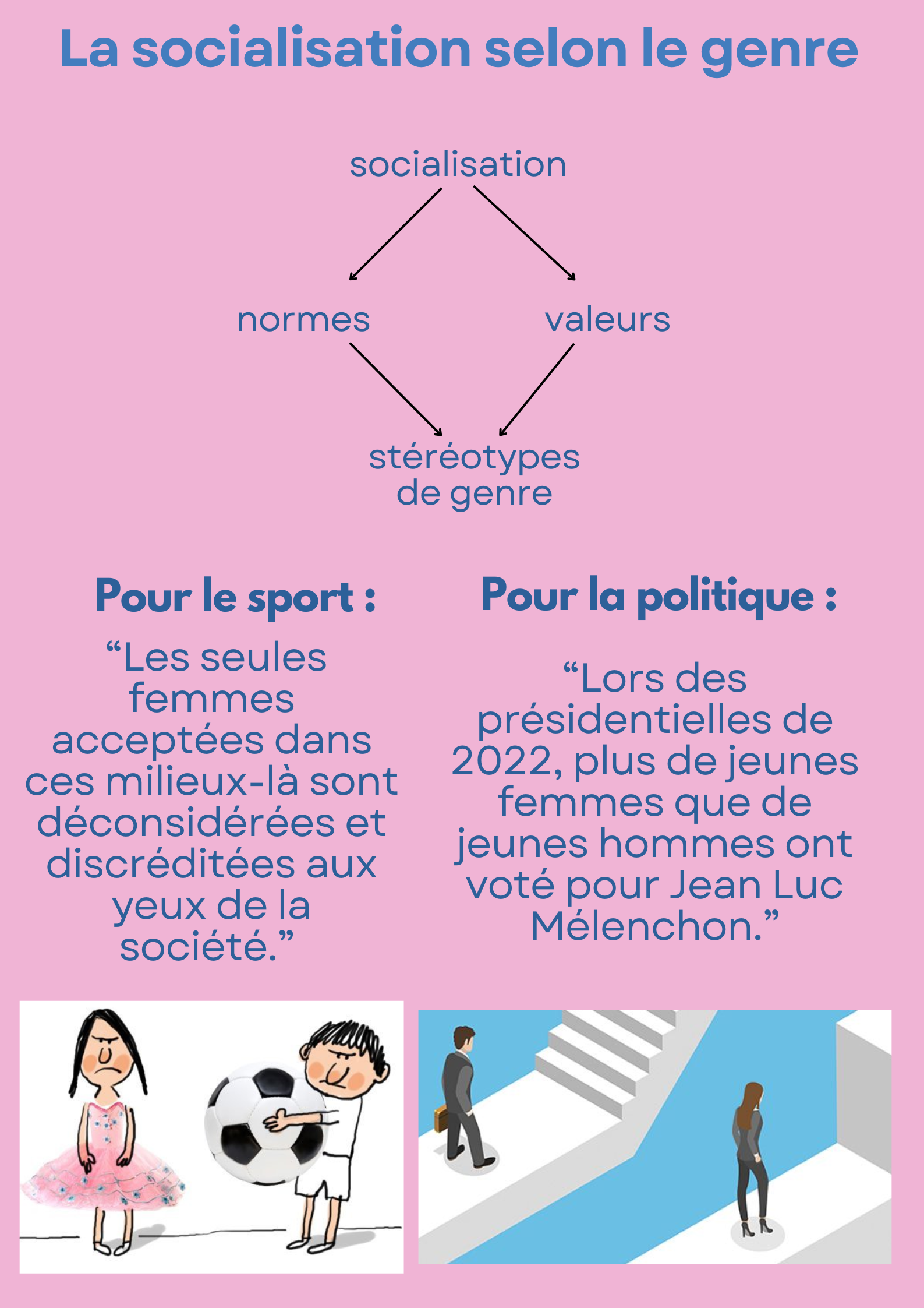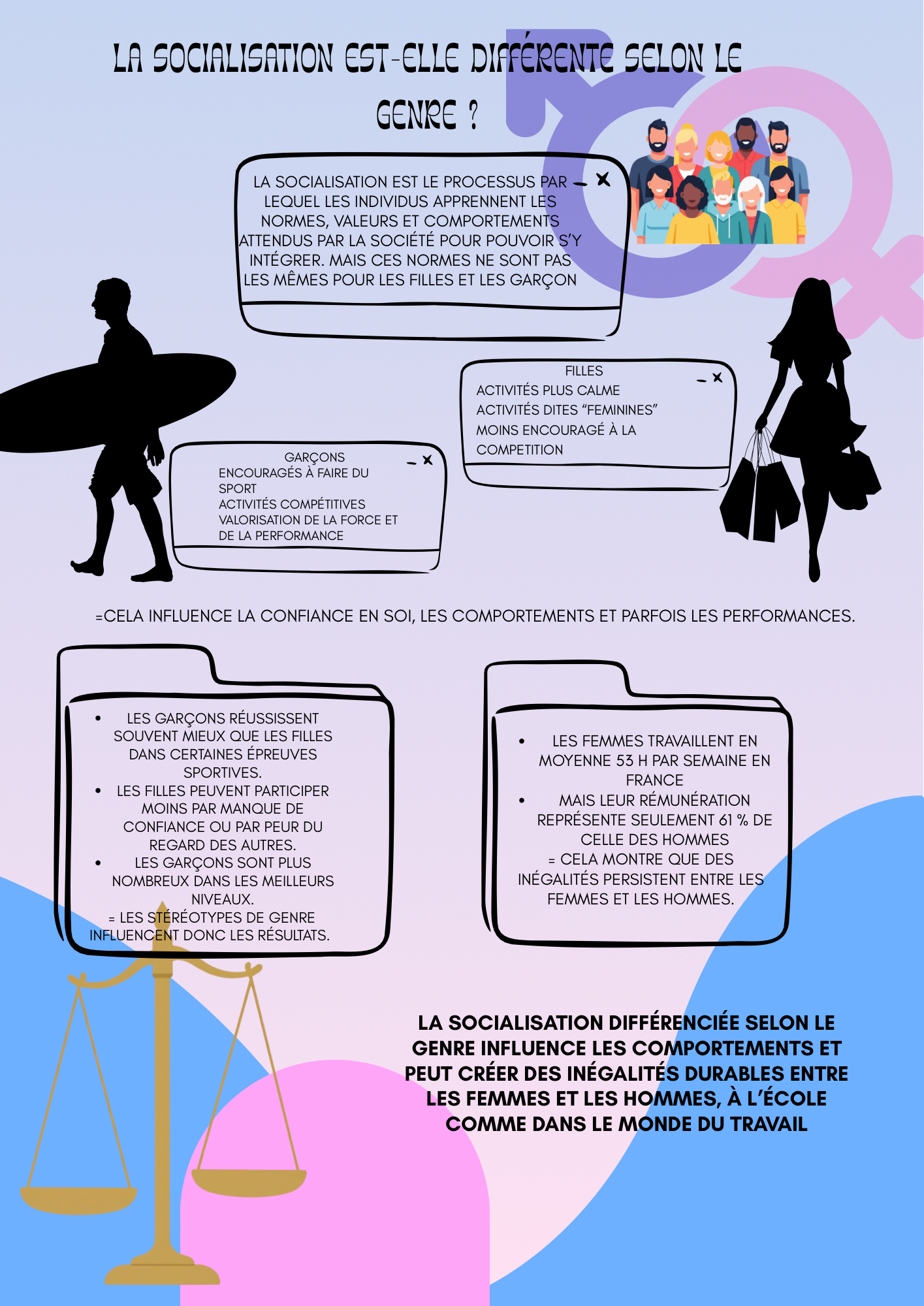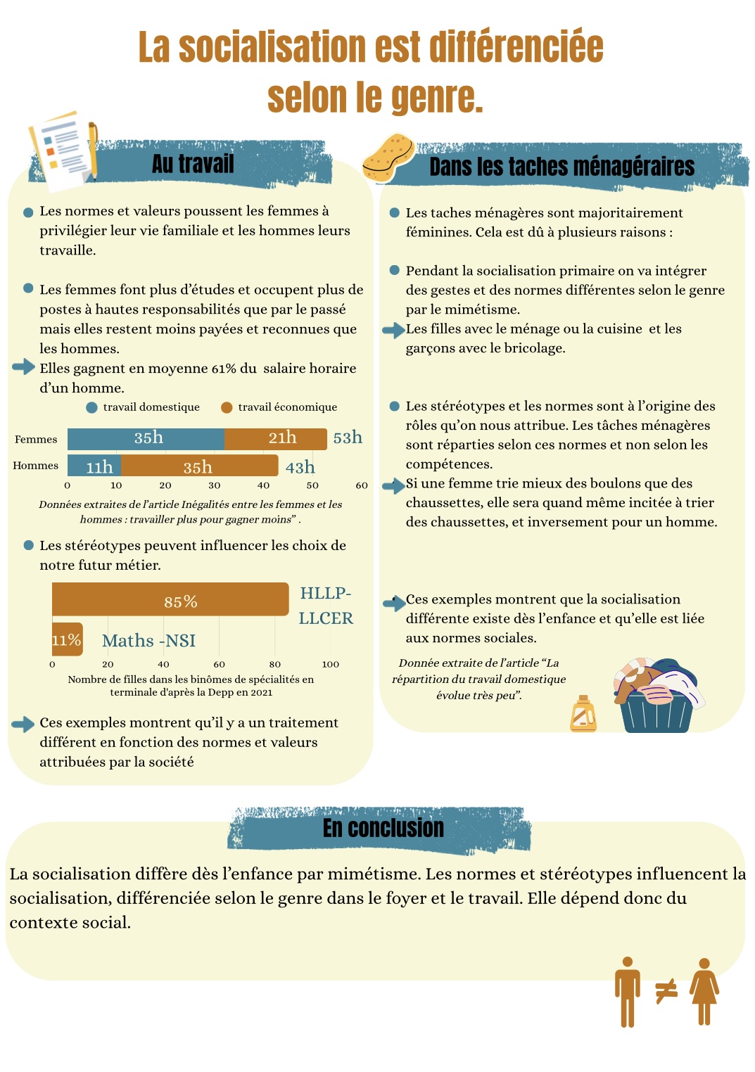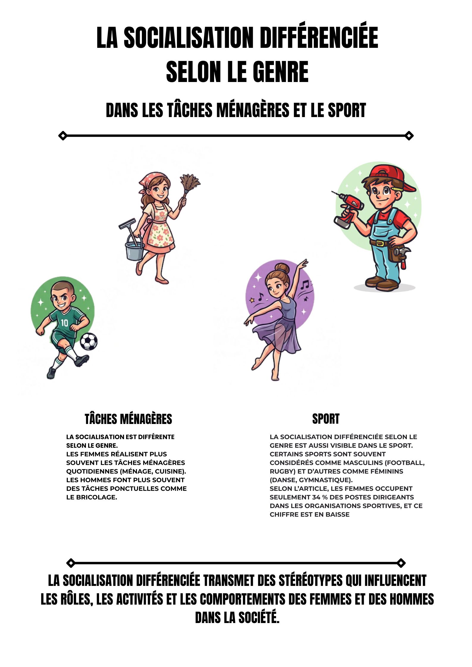 Dans le cadre des programmes en SES plusieurs élèves ont réalisé des affiches afin d'expliquer le processus de différenciation selon le genre depuis l'enfance, dans le sport, au travail et au niveau de la répartition des tâches ménagères.