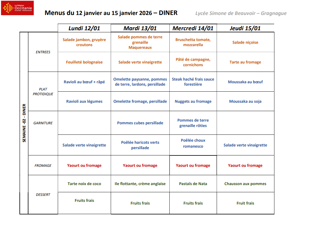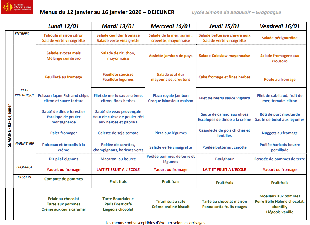 Menus du 12 janvier au 16 janvier 2026