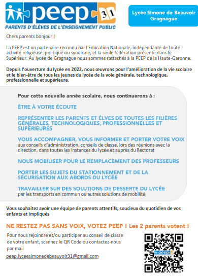 PEEP : peep.lyceesimonedebeauvoir31@gmail.com |