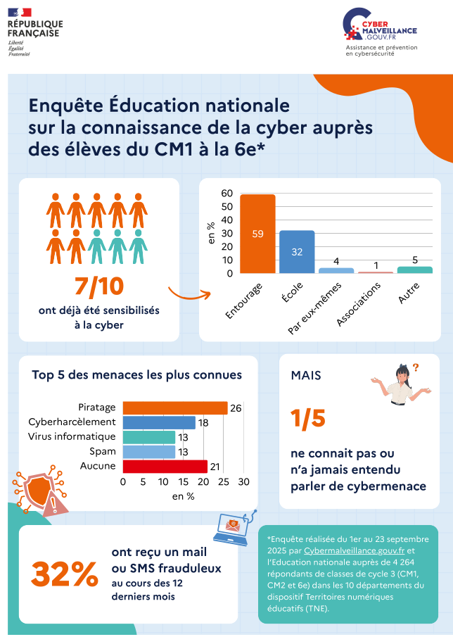 Dans le cadre d’une étude menée auprès d’élèves de 9-12 ans, 31,8 % d’entre eux déclarent avoir déjà été destinataires d’un SMS frauduleux loin devant des actes de cyberharcèlement 15,7 %.